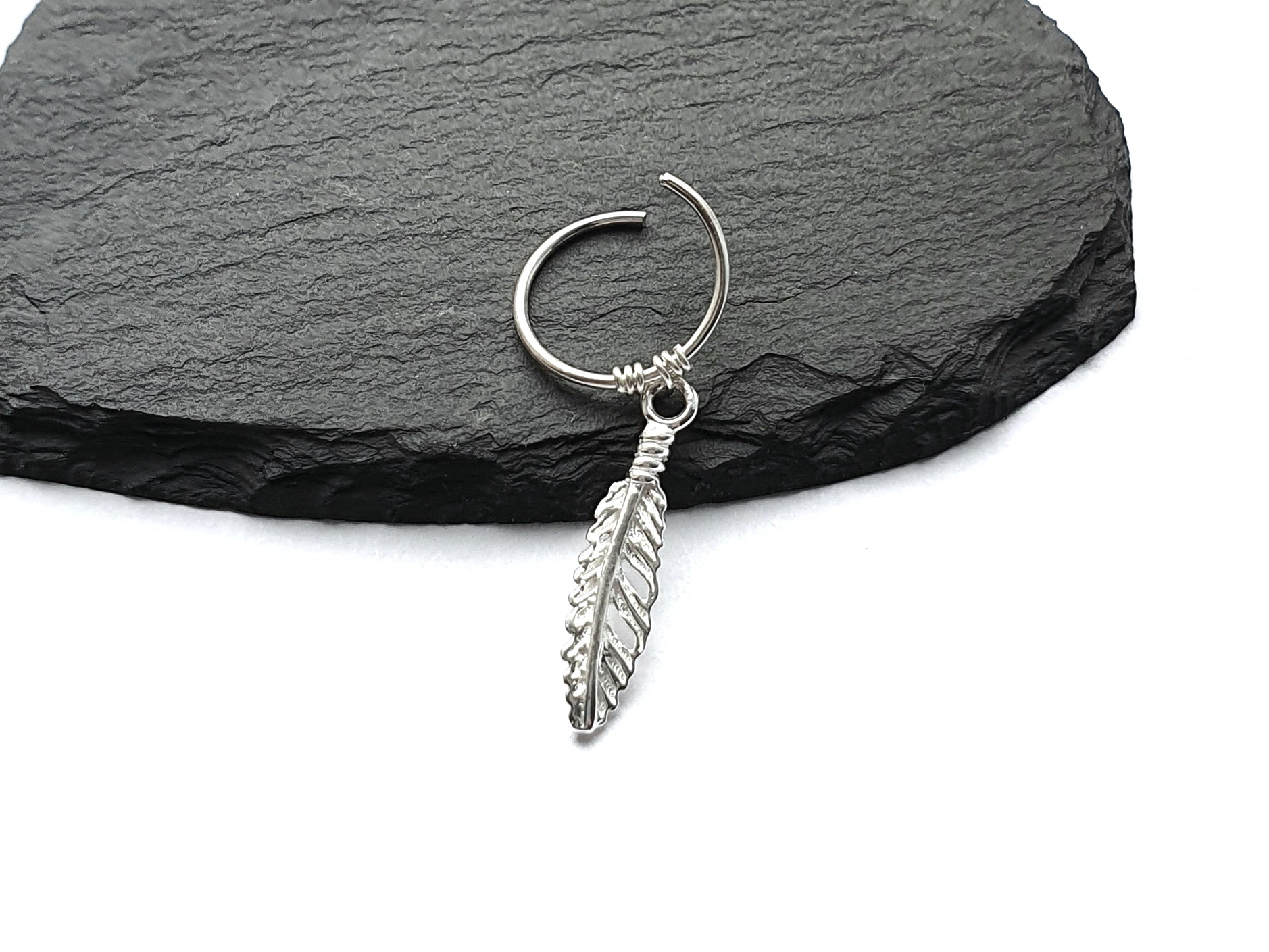 This hoop is made of 925 sterling silver and has a sterling silver feather charm which is 17mm long.
