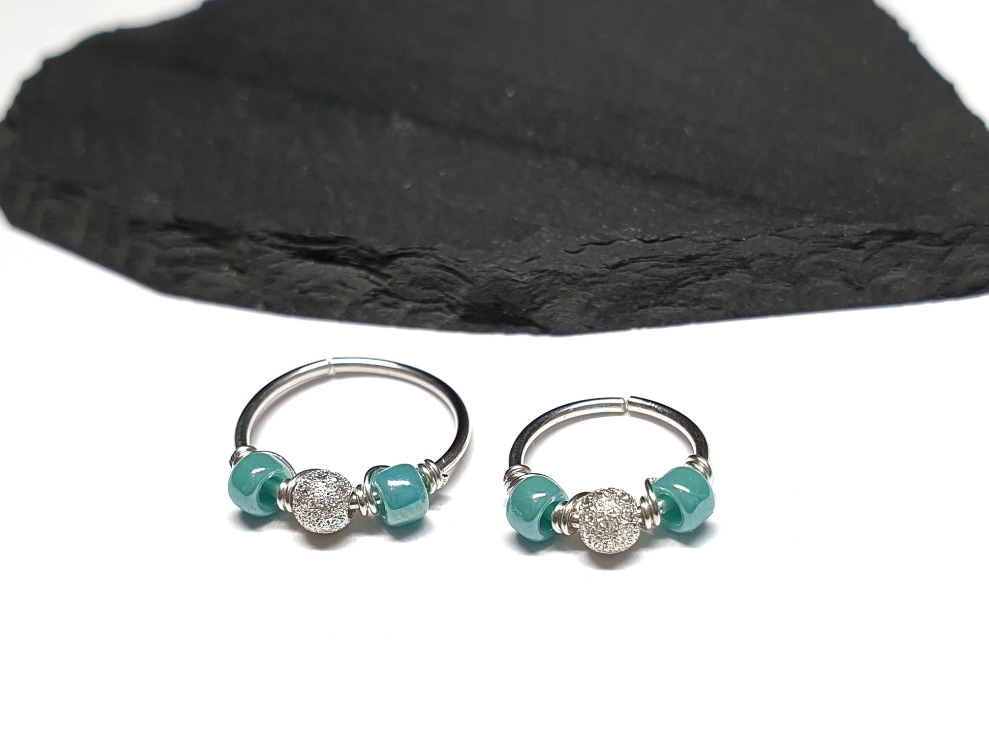 Each hoop has two 3mm turquoise colour glass beads and one 3mm sterling silver sparkly bead. Wrapped on to the hoop with sterling silver wire.